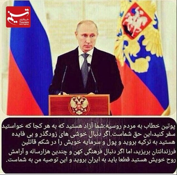چند روز پیش در پستی نامه ای به آقای پوتین نوشتم ،که روسها به ایران بیایند و تمدن و فرهنگ و کشور ایران را ببینند که بسیار جنجال برانگیز شد ،موافقان و مخالفان بسیار داشت اما شواهد امر اینطور نشان میدهد من جواب نامه ام را به درستی گرفتم خواه ایشان نامه را خوانده باشد ،یا نخوانده باشد بقول علما:الله اعلم