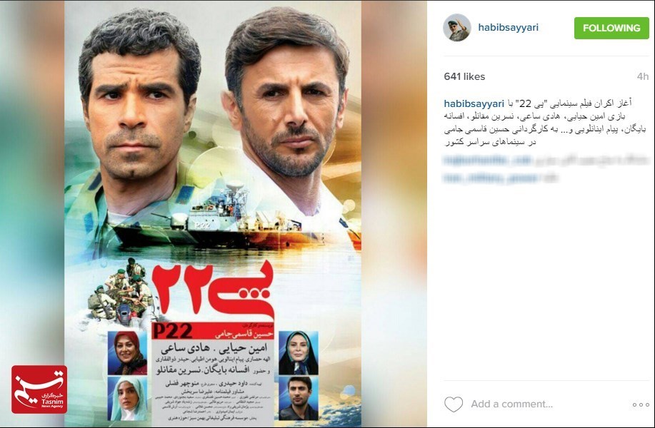دریادار سیاری در صفحه اینستاگرام خود با انتشار پوستر تبلیغاتی فیلم سینمایی "پی22" با هنرنمایی امین حیایی و هادی ساعی خوانندگان را دعوت به دیدن این فیلم کرده است .