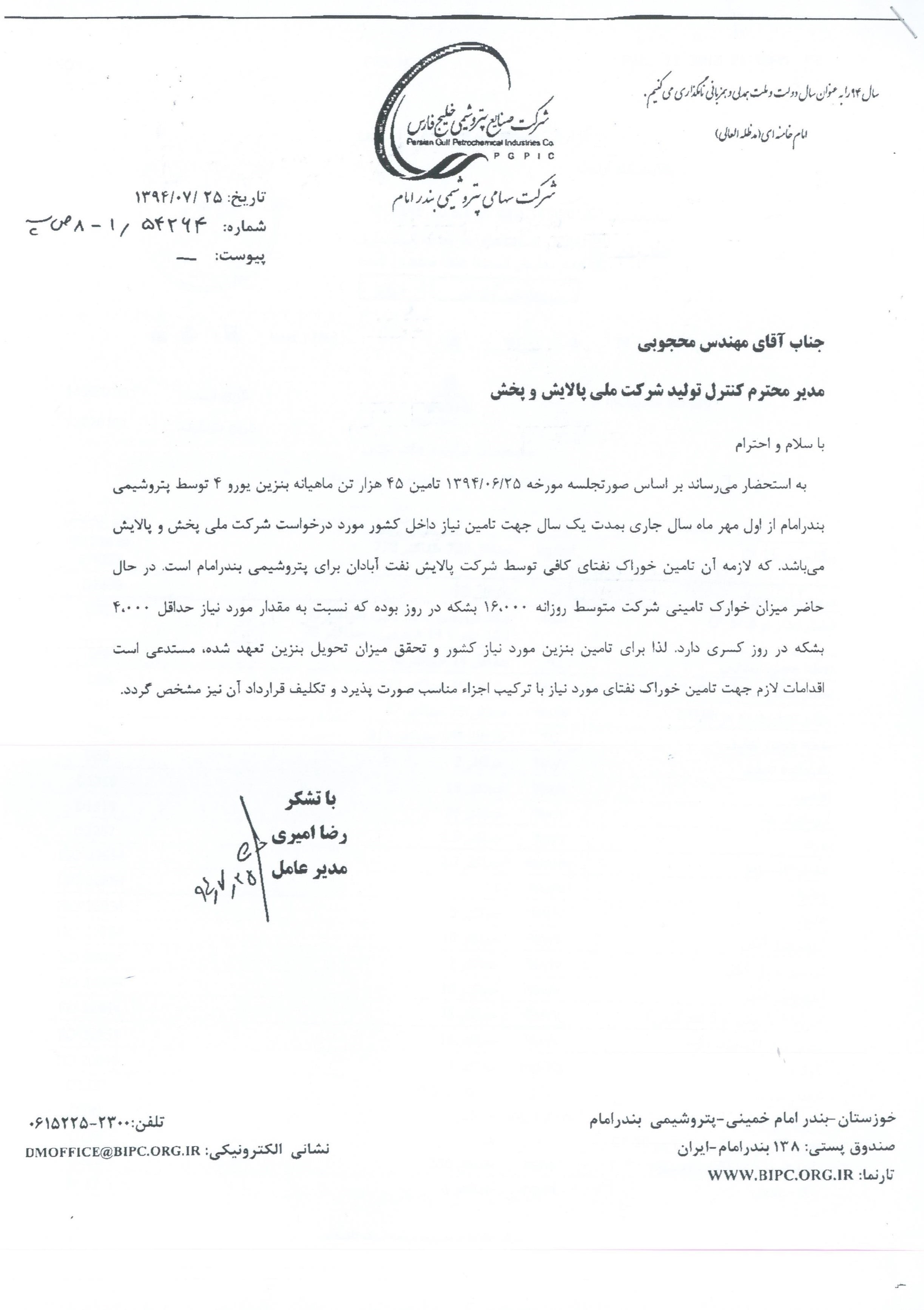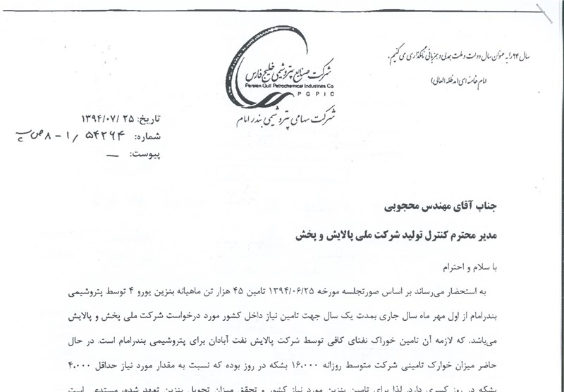 رضا امیری؛ مدیرعامل پتروشیمی بندر امام(ره) در مهر ماه 94 طی نامهای به سعید محجوبی؛ مدیر کنترل تولید شرکت ملی پالایش و پخش با اشاره به قرارداد مورد نظر لازمه اجرای قرارداد را تأمین خوراک نفتای کافی توسط شرکت پالایش نفت آبادان برای پتروشیمی بندر امام اعلام میکند.