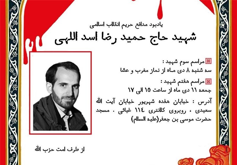 به گزارش خبرنگار فرهنگی خبرگزاری تسنیم، همزمان با سومین شب شهادت شهید مدافع حرم، حمیدرضا اسدالهی، بخشی از وصیت نامۀ این شهید توسط همرزم وی، محسن صیاد در مسجد امام موسی بن جعفر (ع) قرائت شد.