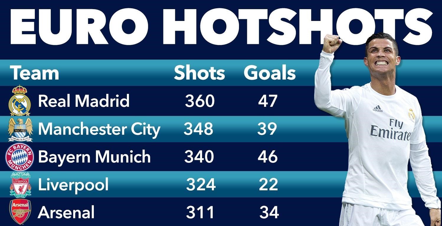 رئالمادرید با 360 شوت به دروازه و 47 گل زده در رده نخست این فهرست قرار دارد. منچسترسیتی با 348 شوت و 39 گل زده در رده دوم است. بایرنمونیخ با 340 شوت و 46 گل زده در رده سوم جای دارد. لیورپول هم که بهتازگی با استخدام یورگن کلوپ پیشرفت قابلتوجهی داشته هم با 324 شوت و 22 گل زده رتبه چهارم را از آن خود کرد. آرسنال هم با 311 شوت و 34 گل زده در رده پنجم ایستاده است.