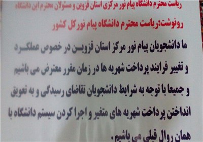 این تجمع به دلیل عدم برنامهریزی مناسب دانشگاه پیام نور قزوین در مورد نحوی واریز شهریههای دانشجویان این دانشگاه با حضور 700 دانشجوی پیام نور استان قزوین برگزار شد.