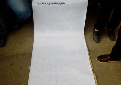 به گزارش خبرگزاری تسنیم از قزوین، جمعی از دانشجویان دانشگاه پیام نور استان قزوین در اعتراض به نحوی مدیریت دانشگاه پیام نور قزوین در دانشگاه پیام نور قزوین تجمع کردند.