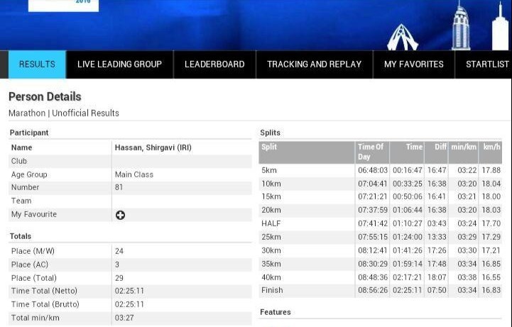 وی گفت: در این مسابقات که مرحله ماقبل آخر انتخابی المپیک رشته دوی ماراتون است، بیش از 3 هزار نفر از کشورهای مختلف جهان در دبی حضور داشتند و من توانستم با تمرینهایی که از قبل داشتم در رده سنی خودم عنوان سوم را کسب کنم و در مجموع نفرات شرکت کننده در این دوره از مسابقات نفر بیست و نهم شدم.