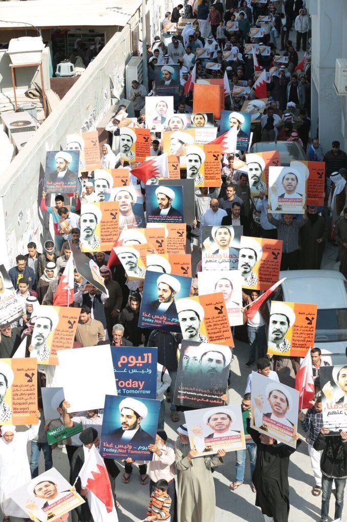 تظاهرکنندگان با در دست داشتن تصاویر شیخ علی سلمان تأکید کردند که هرگز از حمایت از وی دست برنخواهند داشت و تسلیم نخواهند شد.