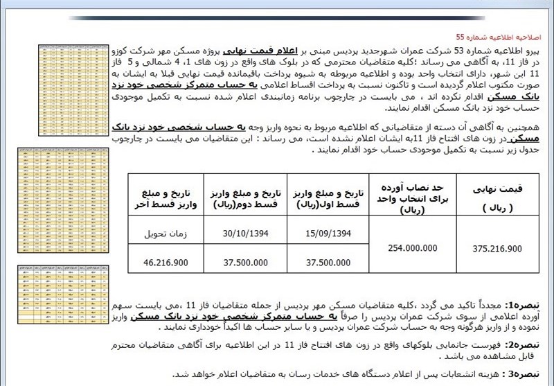 این در حالی بود که شرکت عمران پردیس در اطلاعیه شماره 56 مورخ 26 دیماه سال 94 قیمت نهایی این واحدها را با احتساب هزینه های خرید کنتور و نصب انشعابات آب و فاضلاب ، برق و گاز 39 میلیون و 750 هزار تومان اعلام کرد.