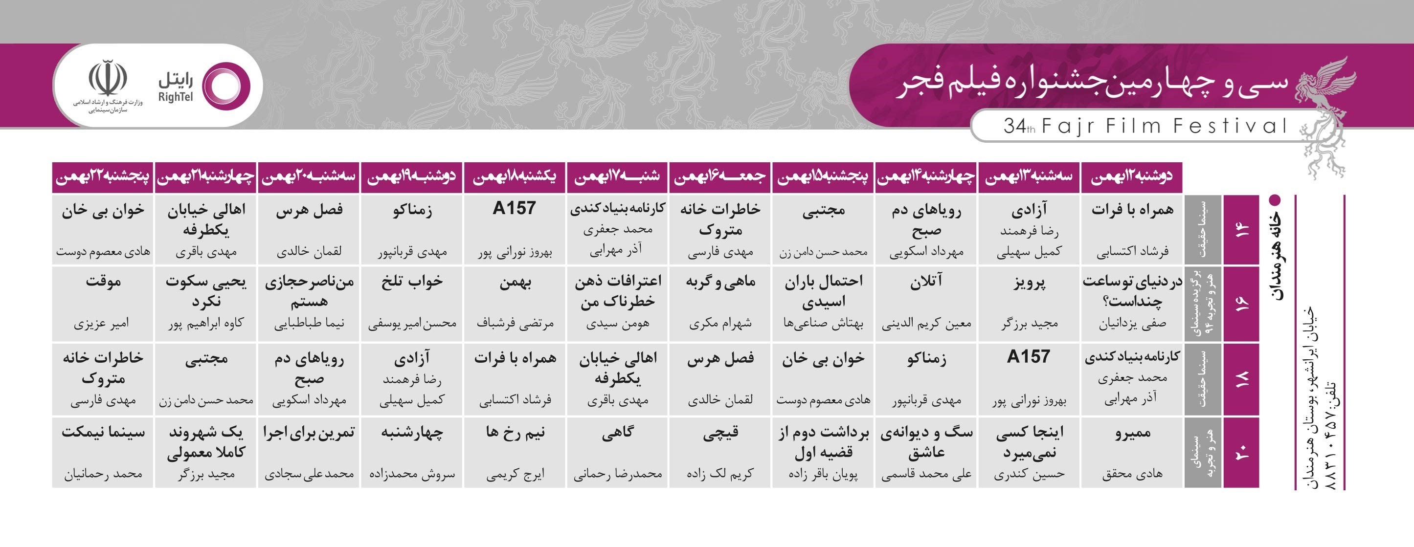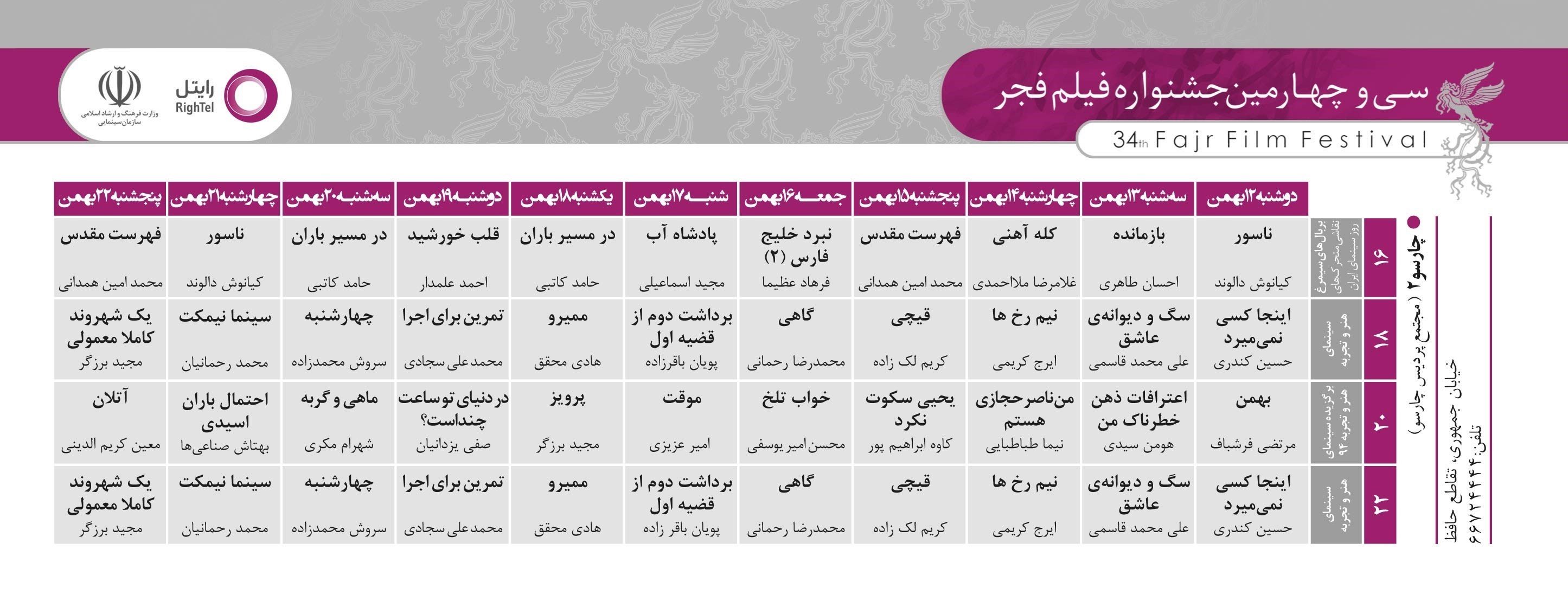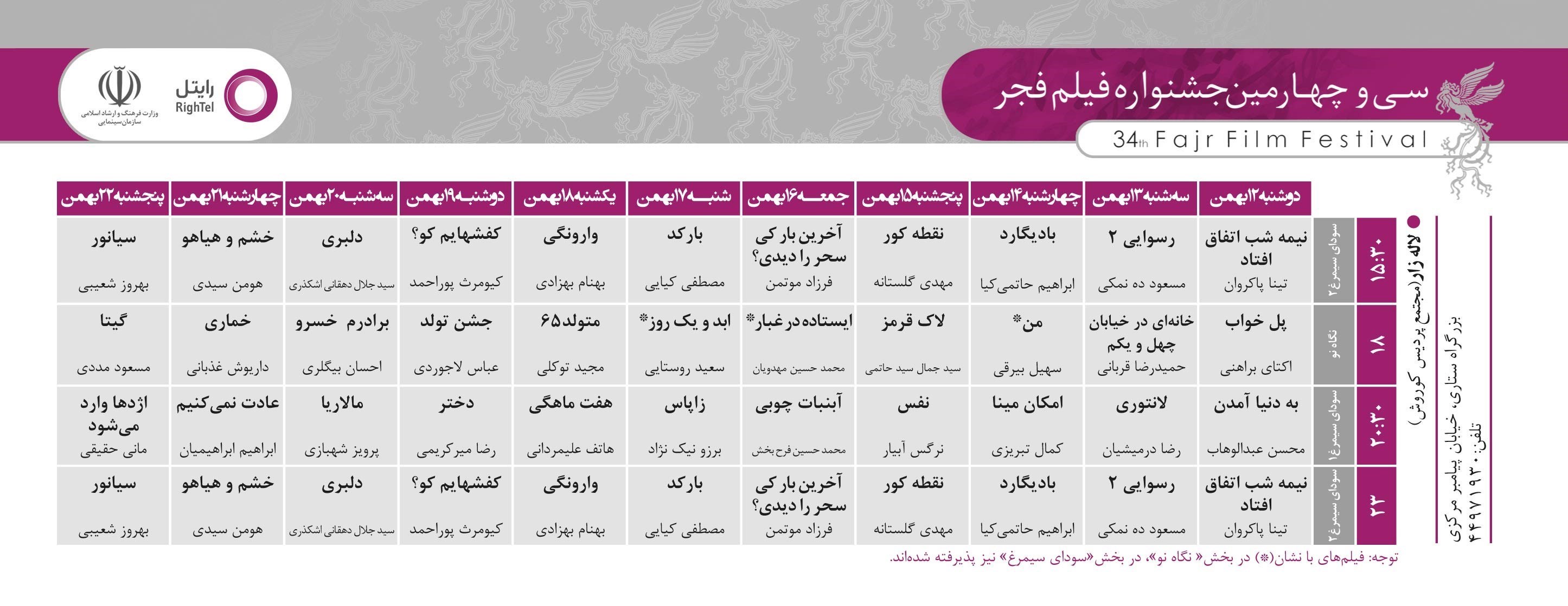 جدول نمایش فیلم های سی و چهارمین جشنواره فیلم فجر در سینماهای مردمی به شرح ذیل منتشر می شود.