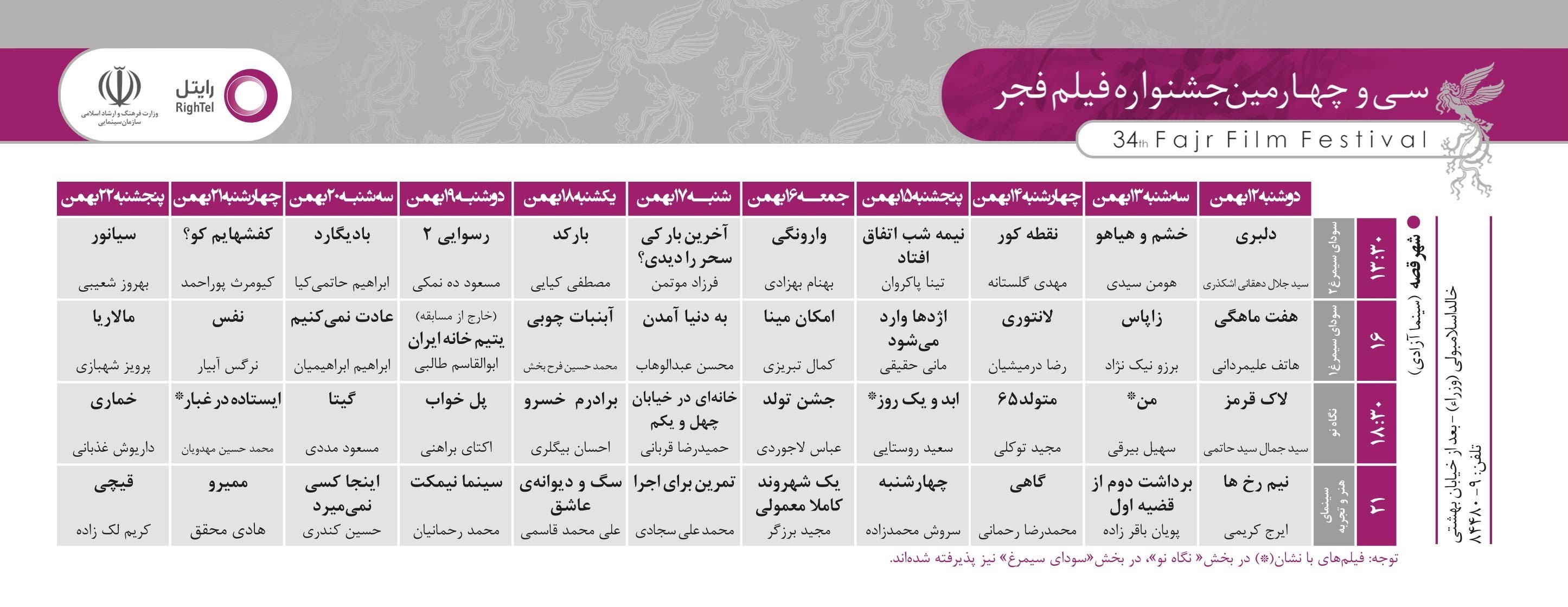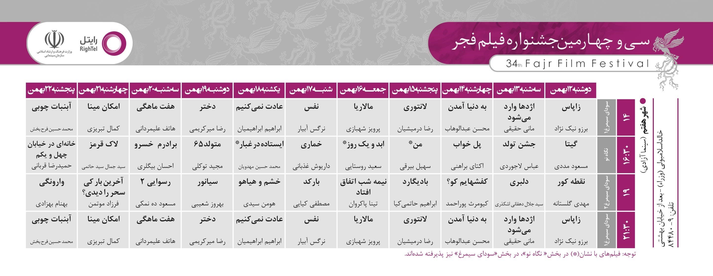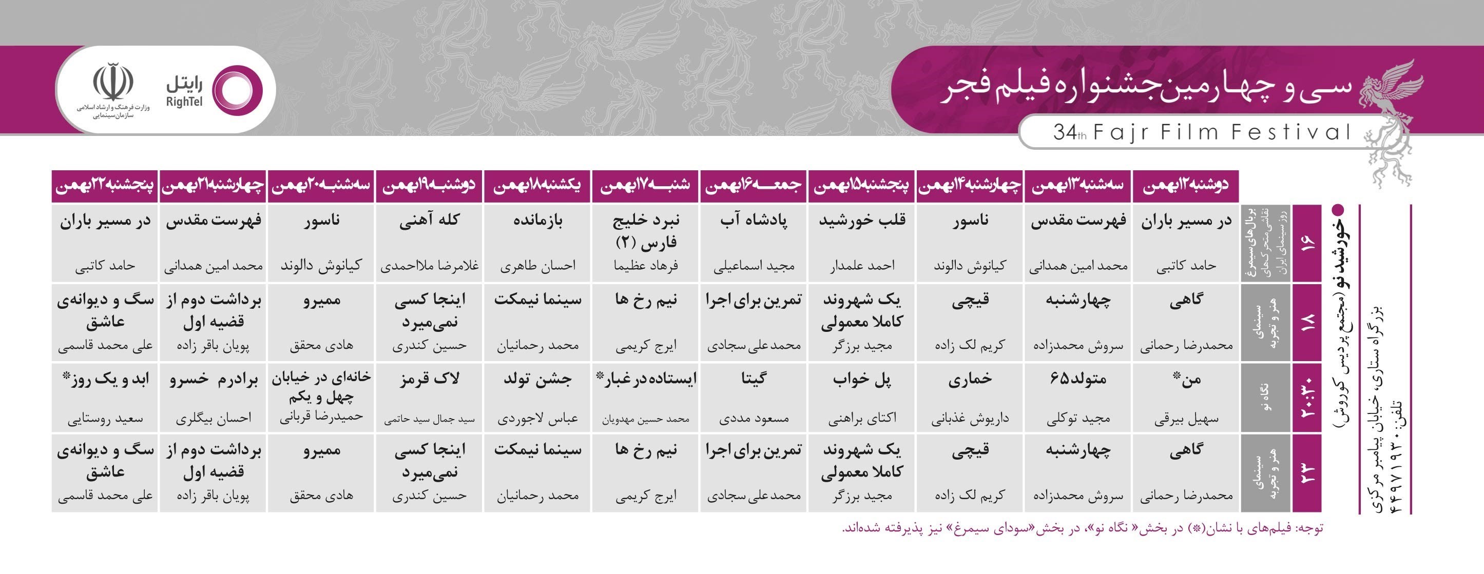 جدول نمایش فیلم های سی و چهارمین جشنواره فیلم فجر در سینماهای مردمی به شرح ذیل منتشر می شود.