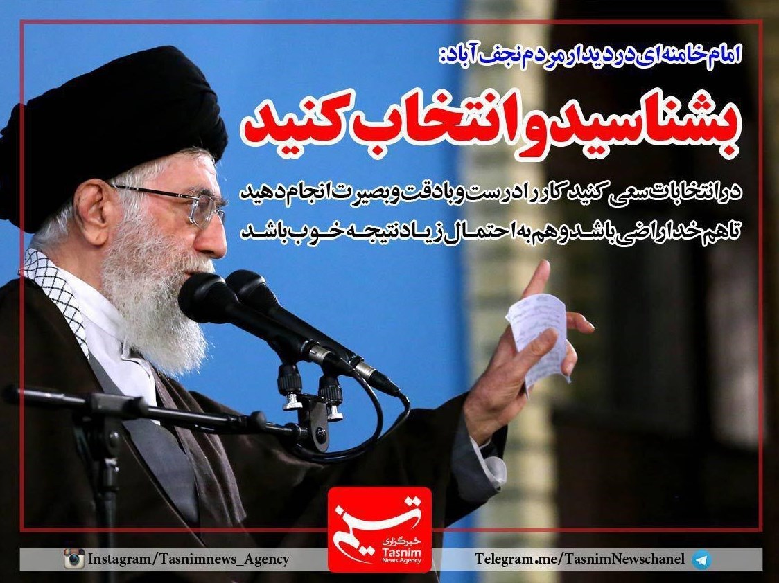 امام خامنه ای در دیدار مردم نجف آباد:در انتخابات سعی کنید کار را درست و با دقت و بصیرت انجام دهید تا هم خدا راضی باشد و هم به احتمال زیاد نتیجه خوب باشد.