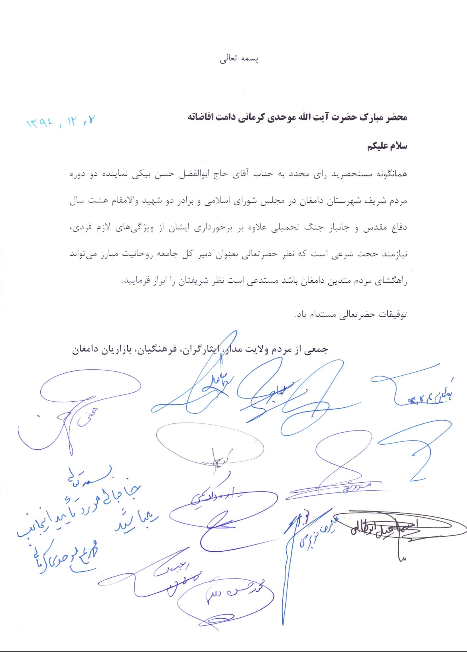 همانگونه مستحضرید رای مجدد به جناب آقای حاج ابوالفضل حسن بیگی نماینده دو دوره مردم شریف شهرستان دامغان در مجلس شورای اسلامی و برادر دو شهید والامقام هشت سال دفاع مقدس و جنگ تحمیلی علاوه بر برخورداری ایشان از ویژگیهای لازم فردی، نیازمند حجت شرعی است که نظر حضرتعالی بهعنوان دبیرکل جامعه روحانیت مبارز میتواند راهگشای مردم متدین دامغان باشد مستدعی است نظر شریفتان را ابراز فرمائید.