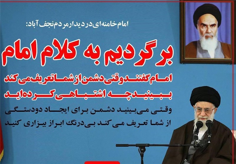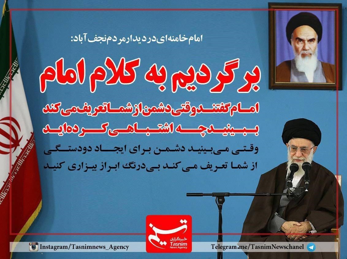 حضرت آیت‌الله خامنه‌ای در دیدار مردم نجف آباد:امام گفتند وقتی دشمن از شما تعریف می کند ببینید چه اشتباهی کرده اید،وقتی می بینید دشمن برای ایجاد دودستگی از شما تعریف می کند بی درنگ ابراز بیزاری کنید.