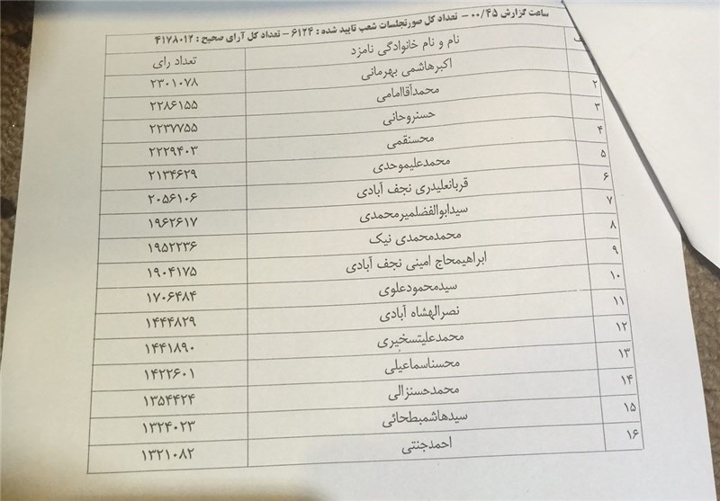 آرای حوزه انتخابیه استان تهران در پنجمین دوره مجلس خبرگان رهبری، از مجموع 6 هزار و 124 صندوق و 4 میلیون و 178 هزار و 12 رأی مأخوذه شمارش شده بهترتیب زیر اعلام میگردد: