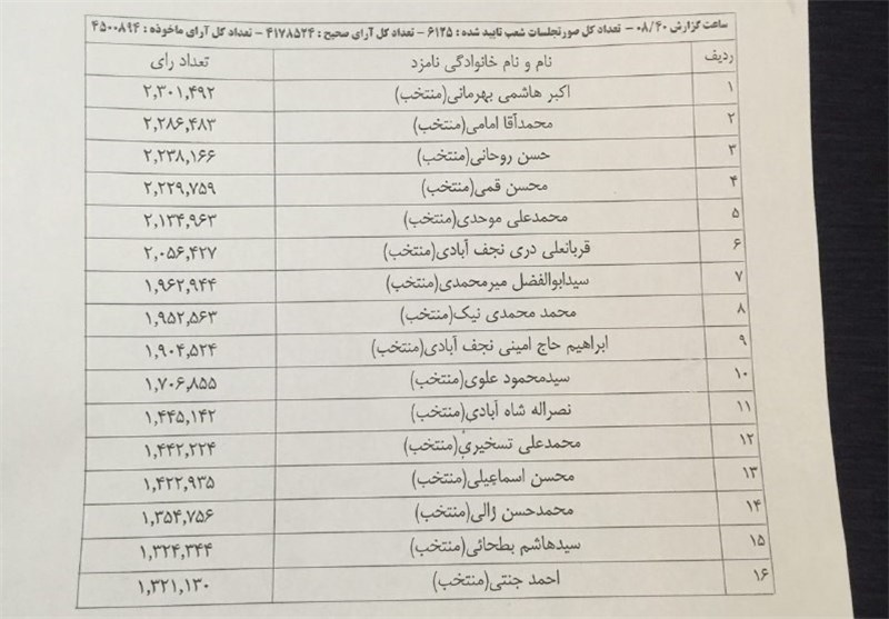 به گزارش خبرنگار سیاسی خبرگزاری تسنیم، ستاد انتخابات کشور بر اساس اطلاعیه شماره 91 با سپاس از حضور پرشور و غرورآفرین ملت ایران در انتخابات، نتایج قطعی شمارش آرای پنجمین دوره انتخابات مجلس خبرگان رهبری از کل 4500894 آرای مأخوذه را اعلام کرد که بهشرح ذیل است: