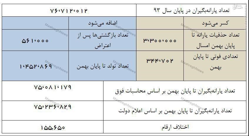 محاسبه آمار فوق نشان میدهد در پایان بهمنماه باید به 75٬081٬000 نفر یارانه پرداخت میشد، اما آنطور که رئیس سازمان هدفمندی یارانهها به ایرنا گفته در بهمن ماه امسال به تعداد 75٬236٬000 نفر یارانه پرداخت شده است.