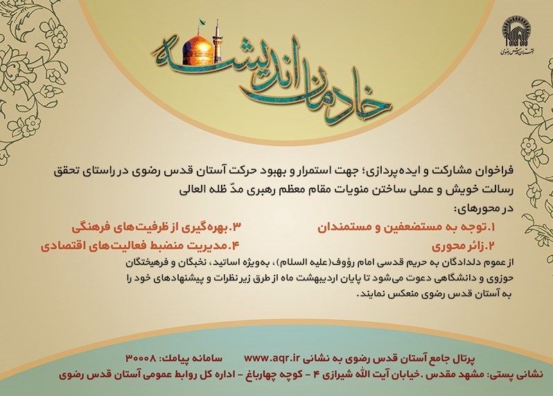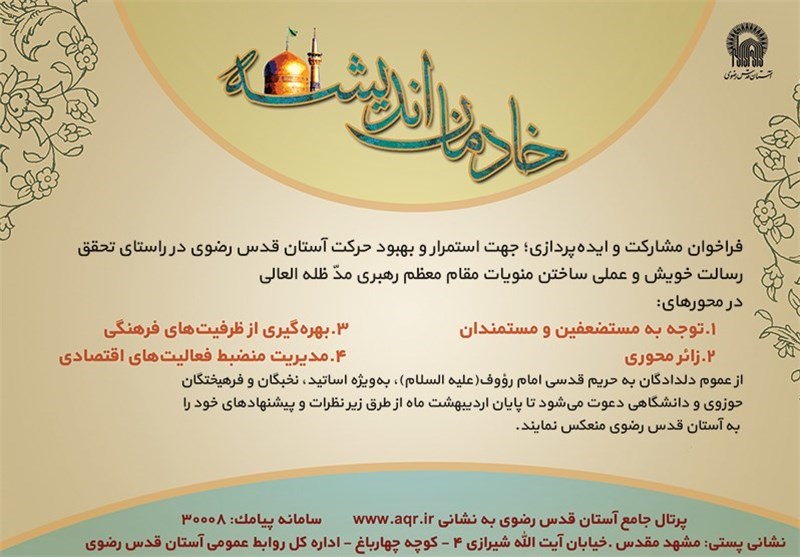 آستان قدس رضوی از عموم دلدادگان به حریم قدسی امام رضا (علیه السلام)، بهویژه استادان، نخبگان و فرهیختگان حوزوی و دانشگاهی دعوت کرده است، تا پایان اردیبهشت ماه از طریق مراجعه به پورتال جامع آستان قدس رضوی به نشانی aqr.ir ، ارسال پیامک به سامانه 30008 و ارسال پستی نظرات به اداره کل روابط عمومی آستان قدس رضوی واقع در مشهد مقدس ـ خیابان آیت الله شیرازی 4 ـ کوچه چهارباغ، پیشنهادهای خود را به آستان قدس رضوی منعکس کنند.