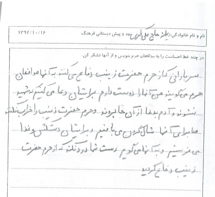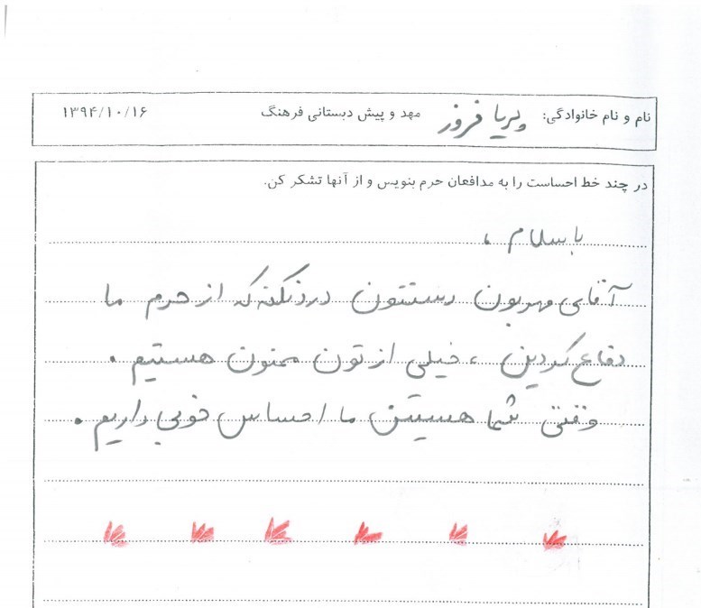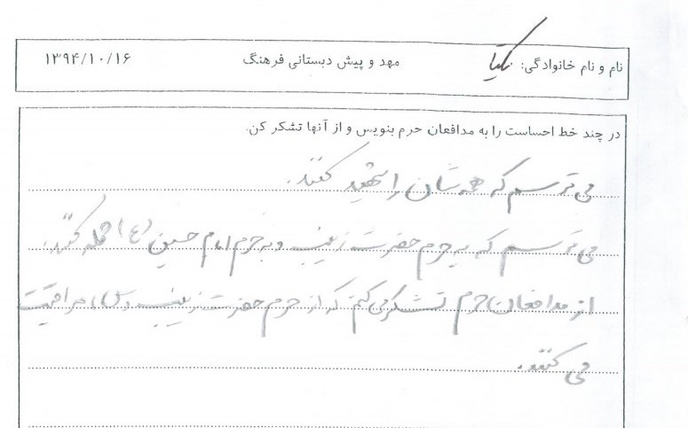 برخی از نوشتههایی که نشان دهنده احساس بچهها به مدافعان حرم است و در قالب جملات بیان شده و مربیها آن یادداشت کردهاند، در ادامه میآید: