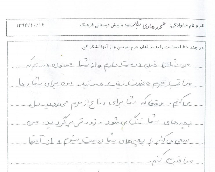سپس از بچهها خواسته شده بود هر دعا یا هر احساسی را که نسبت به مدافعان حرم دارند، بگویند و مربی برای آنها یادداشت کند. برخی از بچهها نیز در منزل این کار را انجام دادهاند و والدین، احساس فرزند خود را نوشتند. همچنین بچهها نگاه کودکانه خود را درباره مدافعان حرم و شهدای مدافع حرم در نقاشی به تصویر کشیدهاند. این نقاشیها بسته بندی شد و به دست مدافعان حرم در سوریه هم رسانده شده است.