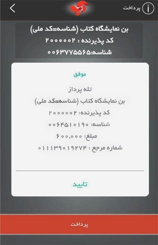 گام پنجم: درصورت انجام موفق پرداخت پیغام موفق بودن عملیات نمایش داده میشود. همچنین یک پیامک از شماره 2000733 شامل کد ملی، اطلاعات پرداخت به همراه کد رهگیری بن کتاب برای شما ارسال میشود.