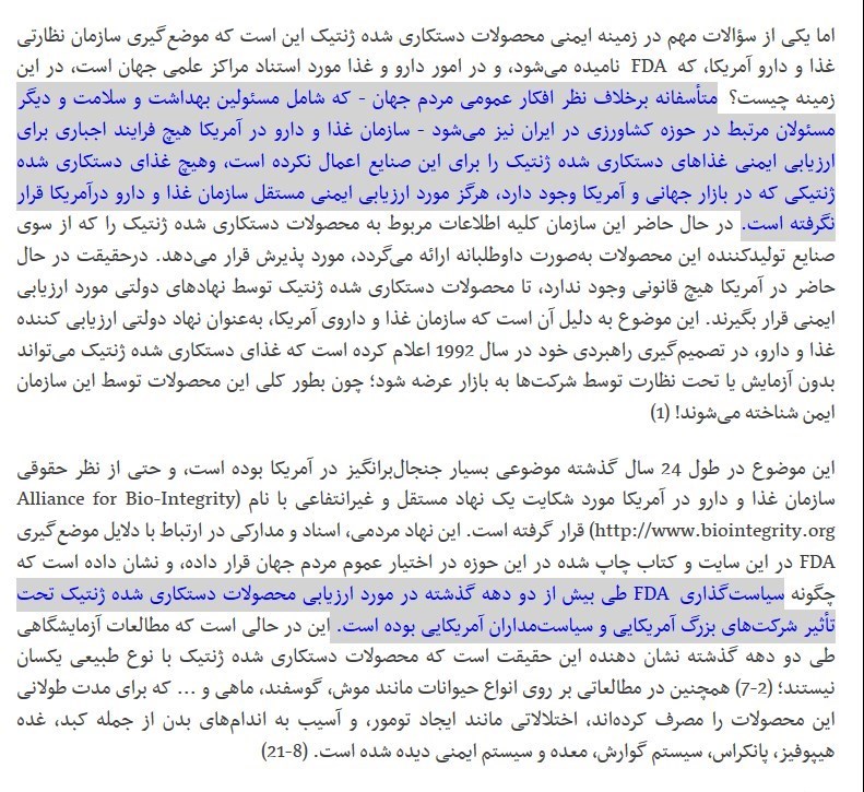 د) پیش از این در خبرگزاری تسنیم، اثبات کردیم {اینجا} که تأییدیه‌های بین‌المللی محصولات تراریخته، حتی برای FDA امریکا، بر اساس خوداظهاری تولیدکننده صادر می‌شود؛ که به هیچ عنوان برای تأیید سلامت این محصولات کافی نیست. آیا رئیس سازمان غذا و دارو از این فرایند ناقص مطلعند، و به این مجوزها استناد می‌کنند؟