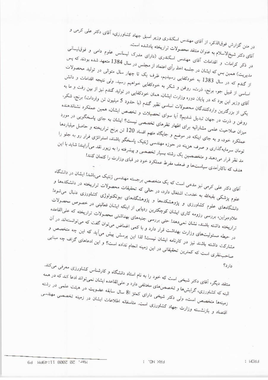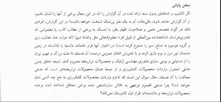 * کلیدواژههای غیرعلمی و توهینآمیز این بند: اکاذیب – ادعاهای بدون سند ارائه شده – طنز بی نمک – افرادی فاقد هرگونه تخصص علمی و صلاحیت اظهار نظر – تمسک به برخی مطالب کذب و مغشوش – فناوری هراسان شناخته شده بین المللی – افراد معلوم الحال – دشمنان این مرز و بوم – تشویش اذهان – درصدد هستند ملت بزرگ و فهیم ایران را از دستیابی به و بومی سازی فناوری مهندسی ژنتیک و محصولات تراریخته محروم کنند – استمرارواردات محصولات کشاورزی – تداوم واردات به نفع چه کسی تمام میشود؟ - تلاش سازمان دهی شده برخی محافل شناخته شده بر علیه محصولات تراریخته و دانشمندان طراز اول