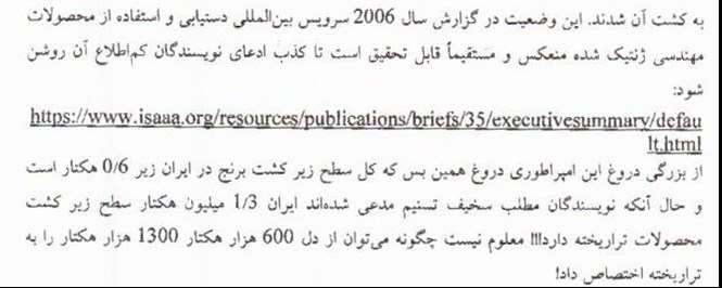 د) بخش دیگری از جوابیه، «دروغ بزرگ امپراطوری دروغ» مخالفان تراریخته را به سخره گرفته و پرسیده است که چگونه ممکن است از دل 600 هزار هکتار سطح زیر کشت برنج کشور، 1.3 میلیون هکتار به این امر اختصاص یابد!