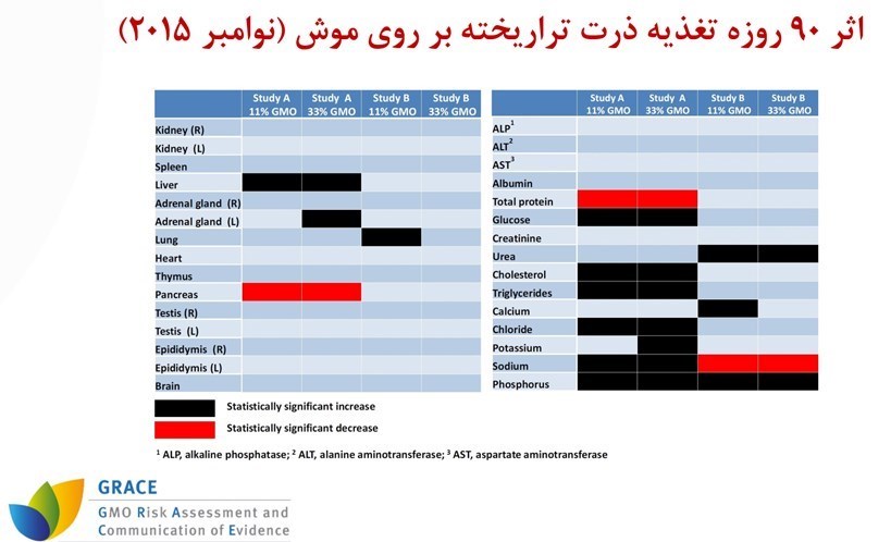 در یک نمونه چندی پیش نتایج تحقیق بر ذرت موسوم به «بی تی 176» در پارلمان اروپا منتشر شد. این نوع ذرت دستکاری شده ژنتیکی (تراریخته) برای تغذیه دام و طیور استفاده میشود. «ژیل اریک سرالینی» استاد دانشگاه کان فرانسه، ریاست گروه تحقیق درباره این گونه از ذرت را بر عهده داشته است. او درباره نتایج بدست آمده گفت: «ذرتهایی که از لحاظ ژنتیکی دستکاری شدند و به نام «بی تی» مشهور هستند حدود پانزده درصد سموم حشرهکش دارند و مصرف بلندمدت آنها میتواند موجب بروز مشکلات کلیوی، غدد پستانی (شیری) و غیره شود. اگر این محصولات را به شکل بلندمدت و بر روی یک حیوان آزمایش کنید به نتایجی که گفتم میرسید.» محققان دانشگاه کان فرانسه برای رسیدن به این نتایج، آثار ذرت «بی تی 176» را بر روی هفتاد رأس گاو و طی 5 سال مورد بررسی قرار دادند. گاوهای مورد آزمایش قرار گرفته طی این مدت از این نوع ذرت تغذیه میکردند. فیلم این تحقیق را ببینید.