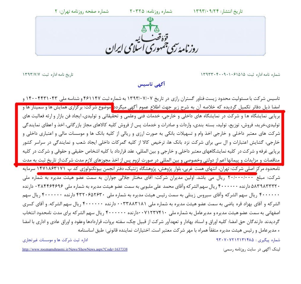 تصویر یکی از شرکتهای ثبت شده، که تحت پوشش «دانش بنیان» و با استفاده از محل پژوهشگاه ژنتیک، به فعالیتهای تجاری مشغول است