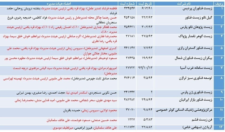 اختصاص منابع پژوهشی دولتی به معدود شرکتهای مرتبط با حلقه بسته تراریختهها - یکی از شرکتها (توسعه فناوری سبز تراژن) در هنگامی که طرحها تصویب شد اصلاً وجود خارجی نداشته و در مرداد 94 ثبت شده است!