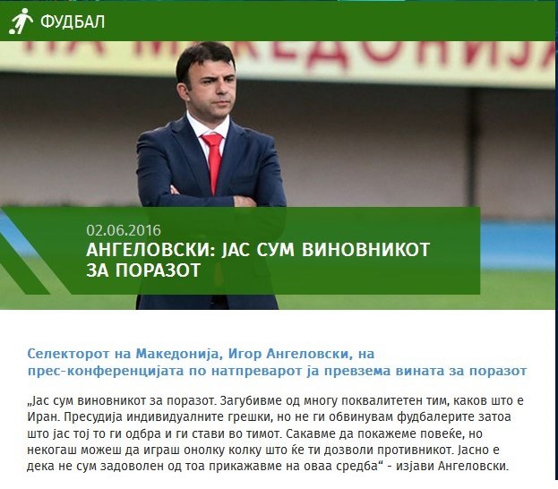 به گزارش خبرگزاری تسنیم، ایگور آنگلوفسکی، سرمربی تیم ملی مقدونیه که امیدوار بود در سالروز 40 سالگی‌اش بتواند با پیروزی برابر ایران جشن بگیرد، پس از قبول شکست خانگی اظهار داشت: من مسئول باخت به ایران هستم.