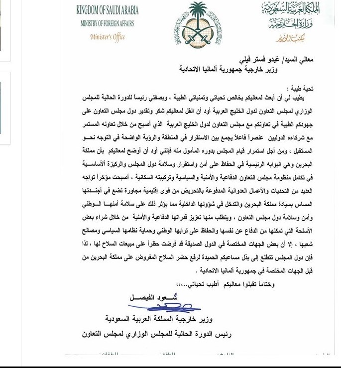بر اساس این اسناد، سعودالفیصل وزیر خارجه سابق سعودی با ارسال نامه‌هایی برای وزیران خارجه پنج کشور غربی شامل آمریکا، انگلیس، آلمان، فرانسه و بلژیک از آنها خواسته بود به منع صادرات تسلیحات به حکومت بحرین که در پی سرکوب جنبش مسالمت آمیز آنها اعمال شده بود، پایان دهند.