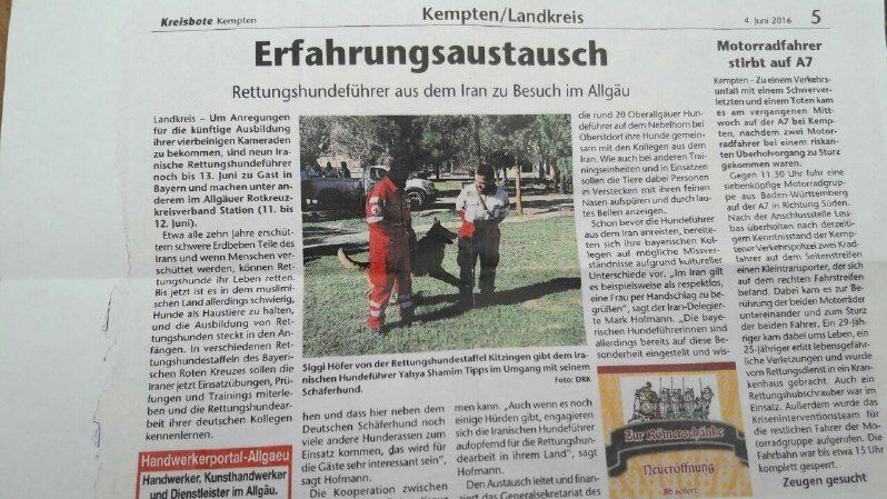 در این زمینه «بایریشه روندفونک» آلمان در گزارشی در این باره، تأکید کرد که ایرانی‌‌ها در اوبرآلگوی (Oberallgäu) در ایالت بایرن زیر دست مربیان آلمانی کار با سگ‌‌های زنده‌ یاب را فرا می‌گیرند. تیم ایرانی با تمرین و امتحان‌ و فراگیری در آلمان تجربه می‌اندوزد تا همراه با سگ‌‌های خود برای عملیات نجات در زلزله‌ بعدی در وطن خود از آمادگی کافی برخوردار باشد. مربیان ایرانی سگ‌‌های زنده‌ یاب در ارتفاعات نبلهورن به همراه سگ‌‌های خود برای جست‌ و جوی مفقودان در مناطقی که ارتفاع برف‌ چندین متر است آموزش‌های لازم را فرا گرفتند.