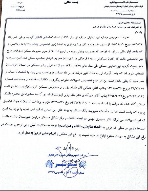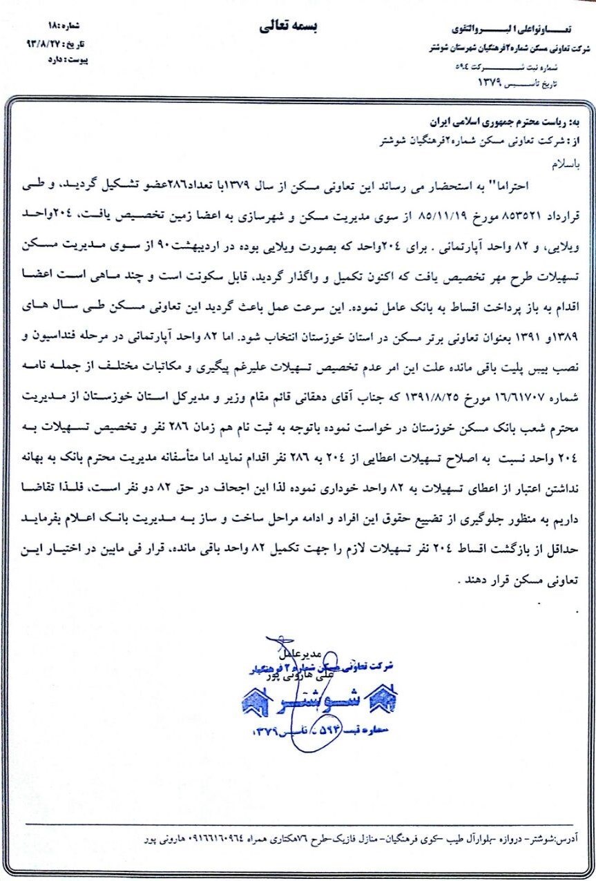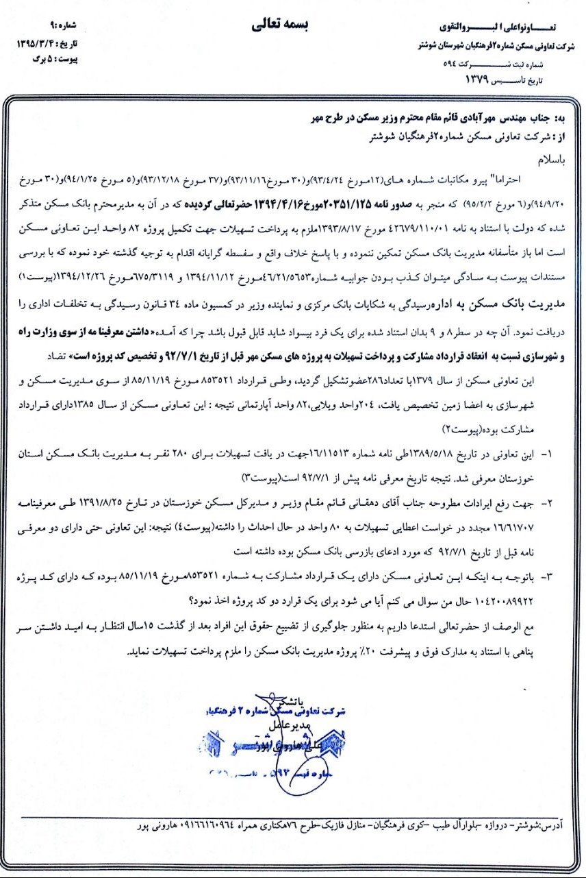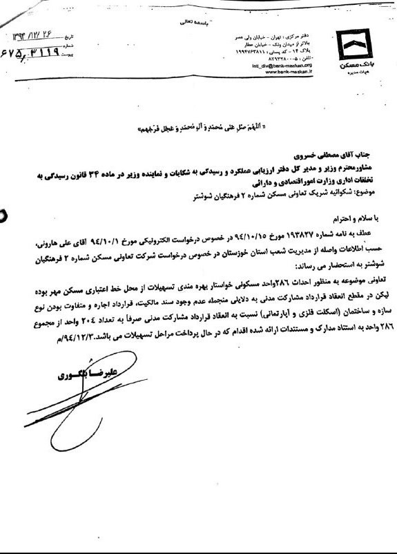 وی با بیان این‌که تمام این پروژه در قالب یک قرارداد بوده و درخوسات بانک مسکن برای ارائه سند باقیمانده آپارتمان‌ها عجیب بود، تصریح کرد: یکماه بعد اسناد واحدهای باقیمانده را ارائه کردیم که رئیس بانک مسکن استان خوزستان به ما گفت فرصت شما برای دریافت تسهیلات تمام شده است.