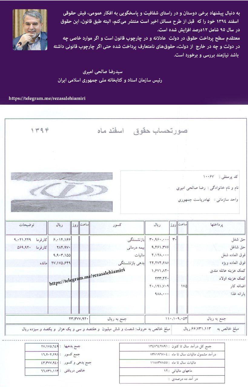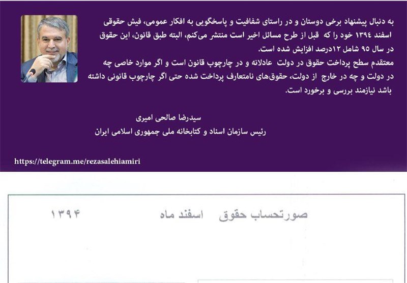 به گزارش گروه رسانههای خبرگزاری تسنیم، او در توضیح خود نوشته است: به دنبال پیشنهاد برخی دوستان و در راستای شفافیت و پاسخگویی به افکار عمومی، فیش حقوقی اسفند 1394 خود را که قبل از طرح مسائل اخیر است منتشر میکنم، البته طبق قانون، این حقوق در سال 95 شامل 12درصد افزایش شده است.