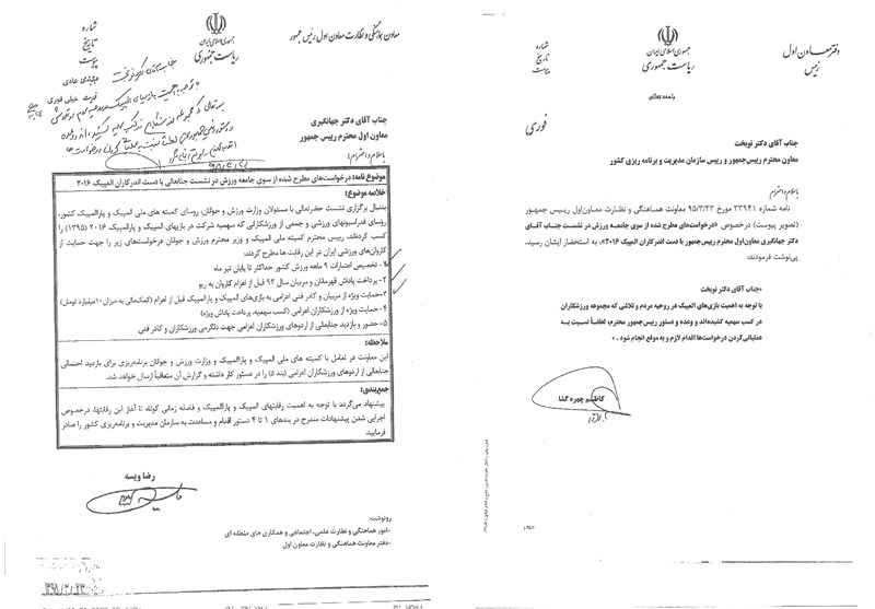 با توجه به اهمیت بازیهای المپیک در روحیه مردم و تلاشی که مجموعه ورزشکاران در کسب سهمیه کشیدهاند و عمده دستور رئیس جمهور محترم، لطفا نسبت به عملیاتی کردن درخواستها اقدام لازم و بهموقع انجام گردد.»