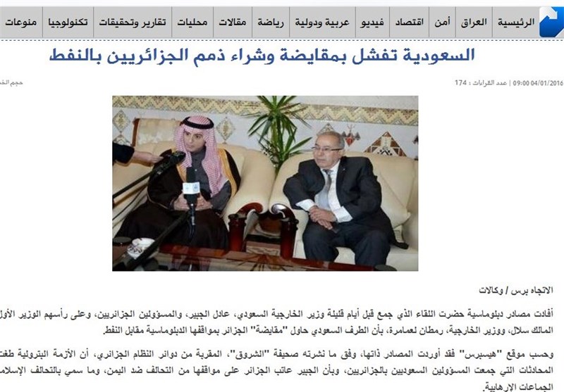 روزنامه الشروق نزدیک به نظام الجزایر از شکست عربستان در انجام معامله و خرید الجزایری‌ها با اهرم نفت پرده برداشته بود. بر اساس این گزارش، عادل الجبیر وزیر خارجه سعودی اخیرا در سفری به الجزایر با مقامات الجزایری از جمله نخست وزیر و وزیر خارجه دیدار می‌کند و خشم آل سعود را از مواضع الجزایر علیه جنگ یمن و همچنین ائتلاف ادعایی عربستان علیه تروریسم ابراز می‌کند. الجبیر تلاش می‌کند با حربه نفت، الجزایری‌ها را به اردوگاه عربستان جذب کند که در این راه شکست می‌خورد،‌ مقامات الجزایری بر تغییرناپذیربودن مواضع و سیاست‌های اصولی کشورشان تاکید می‌کنند. مهمترین دلیل شکست سفر الجبیر،‌خودداری عبدالعزیز بوتفلیقه رئیس جمهور الجزایر از پذیرش وزیر خارجه سعودی بود.