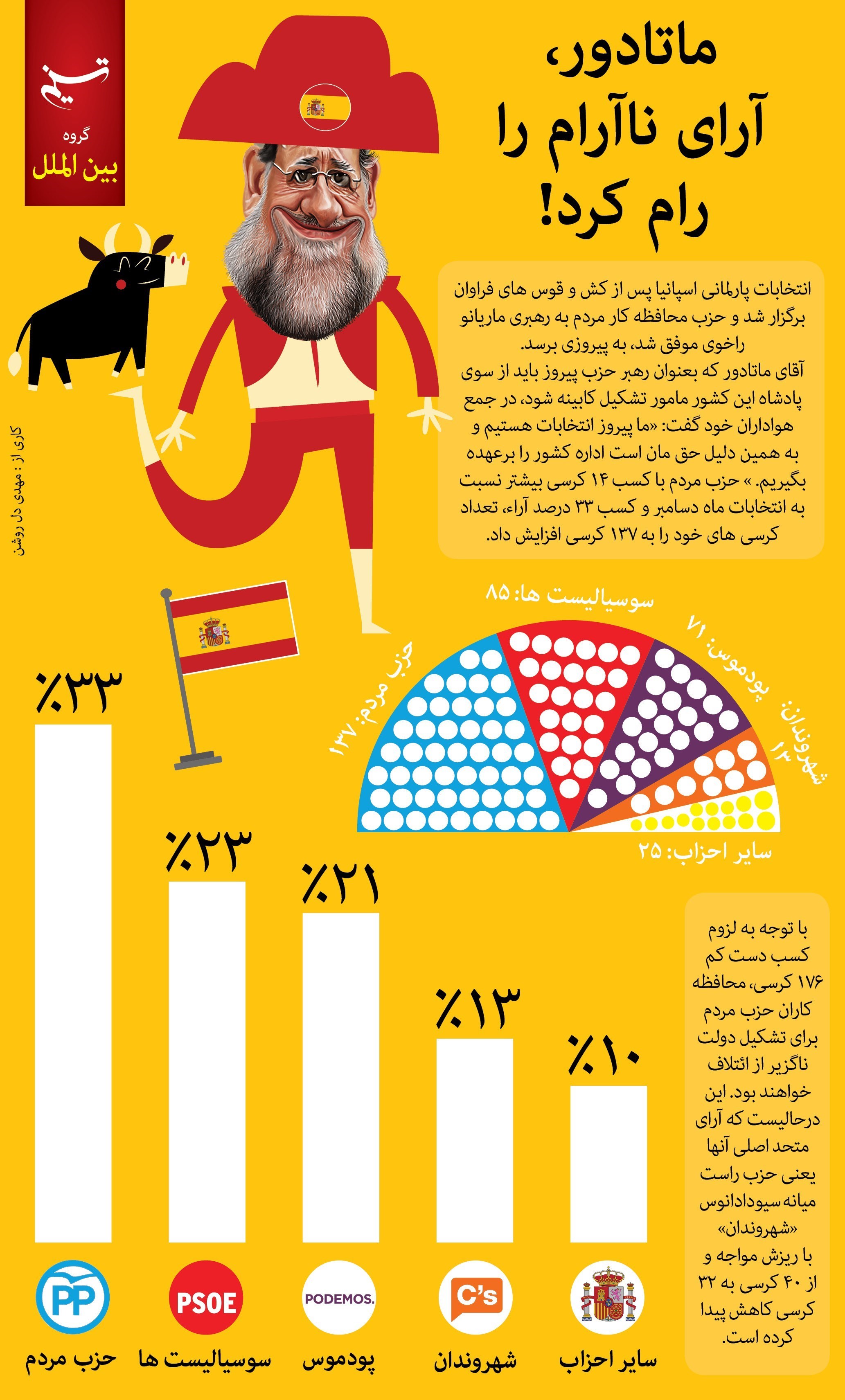 به گزارش گروه بین الملل خبرگزاری تسنیم، آقای ماتادور که بعنوان رهبر حزب پیروز باید از سوی پادشاه این کشور مامور تشکیل کابینه شود، در جمع هواداران خود گفت: «ما پیروز انتخابات هستیم و به همین دلیل حق مان است اداره کشور را برعهده بگیریم. » حزب مردم با کسب 14 کرسی بیشتر نسبت به انتخابات ماه دسامبر و کسب 33 درصد آراء، تعداد کرسیهای خود را به 137 کرسی افزایش داد.