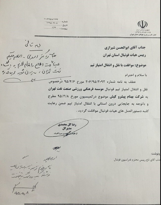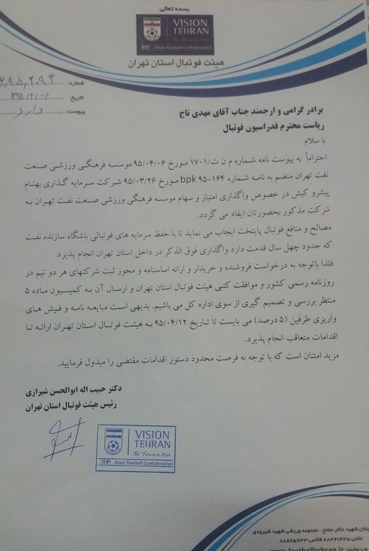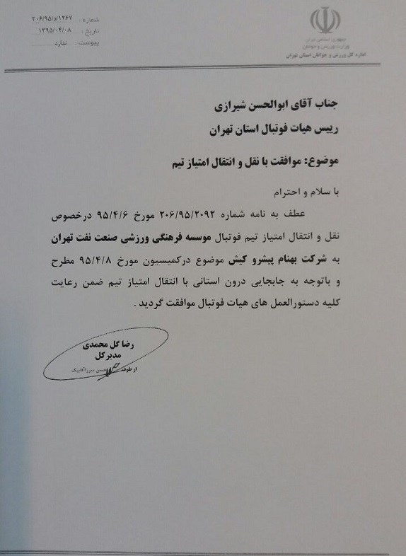 با توجه به اینکه هرگونه واگذاری و انتقال سهام باشگاه بر اساس مقررات جاری منوط به اخذ مجوز کمیسیون ماده پنج را دارد، در این زمینه کمیسیون مذکور از بین همه متقاضیان صرفاً با انتقال سهام باشگاه به شرکت سرمایهگذاری بهنام پیشروی کیش موافقت کرده است. به همین دلیل با توجه به اخذ این مجوز به شماره نامه 1267/د/206/95 به تاریخ 1395/5/8 و احراز شرایط لازم دیگر از سوی شرکت سرمایهگذاری بهنام پیشروی کیش انتقال سهام باشگاه نفت تهران به شرکت بهنام پیشروی کیش نهایی شده است.