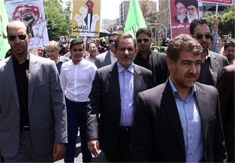 **حضور معاون اول رئیس جمهور، وزیر بهداشت، شهردار تهران، حداد عادل و آیتالله موحدی کرمانی در مراسم روز قدس