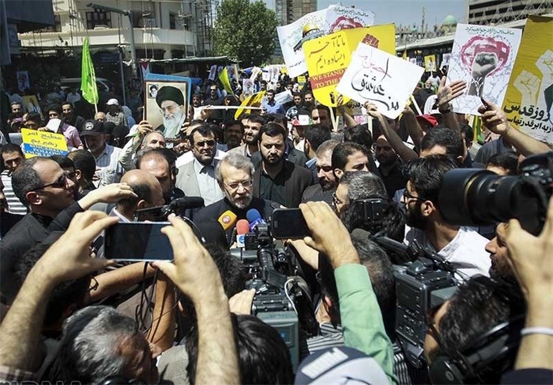 11:08:علی لاریجانی رئیس مجلس شورای اسلامی در حاشیه مراسم راهپیمایی روز قدس، در جمع خبرنگاران، گفت: حضور مردم در راهپیمایی روز قدس بسیار چشمگیر است و تصاویری که رسانهها نیز نشان میدهند، بیانگر این مطلب است.