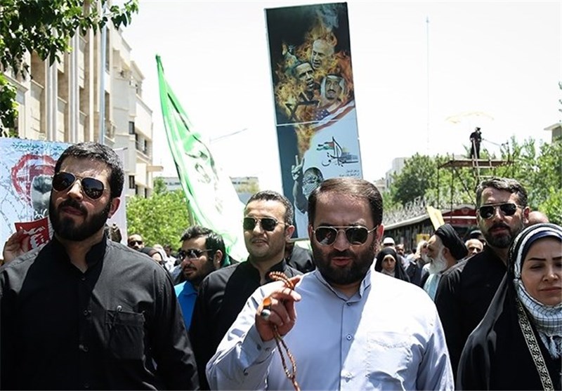 10:48:جمعی از راهپیمایان روز جهانی قدس در تهران ضمن محکوم کردن رابطه گروههای تکفیری و برخی دولتهای عرب منطقه با رژیم صهیونیستی، تابوت برخی مفتیان آلسعود و سران این کشور را در راهپیمایی حمل کردند. همچنین راهپیمایان پلاکاردهایی در محکومیت جنایات مشترک رژیم آلسعود، آل خلیفه و دولتهای مرتجع منطقه علیه ملت مظلوم فلسطین را محکوم کردند.