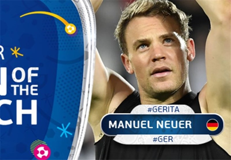 به گزارش خبرگزاری تسنیم، مانوئل نویر، دروازه‌بان تیم ملی فوتبال آلمان به‌عنوان بهترین بازیکن بازی تیمش در مرحله یک چهارم نهایی یورو 2016 مقابل ایتالیا انتخاب شد.