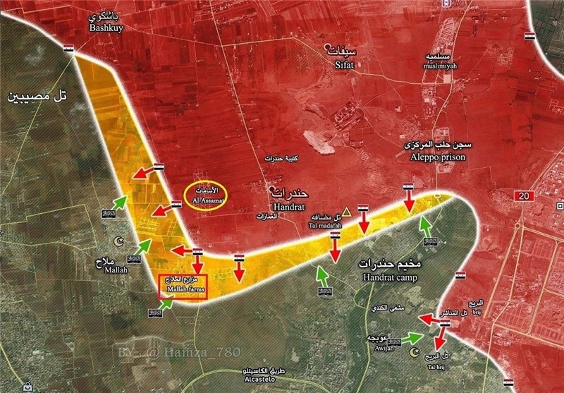 1.ارتش سوریه با آزادسازی کامل مزارع الملاح، جاده الکاستیلو را در تیررس خود قرار داده و به فاصله 1360 متری این جاده رسیده است. این جاده تنها شاهراه برای گروههای تروریستی از حومه شمالی حلب به سمت اردوگاه حندرات و از آنجا به سمت محلات شرقی حلب به شمار میرود.