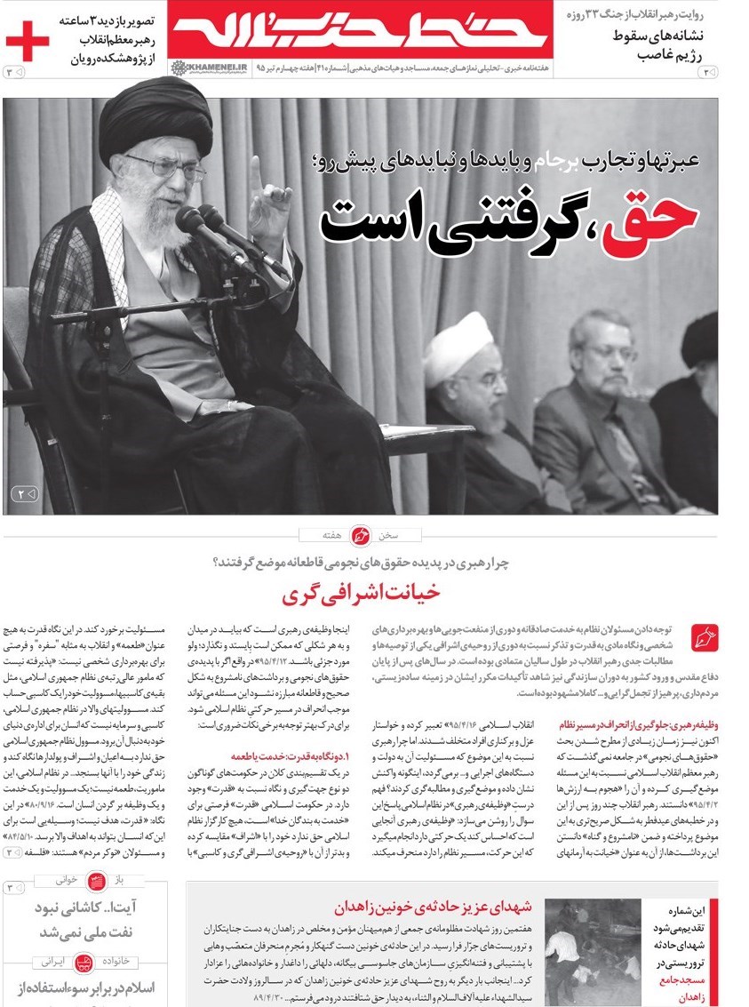 «خیانت اشرافیگری»، سخن هفته این شماره است که خط حزبالله در آن به واکاوی علل موضعگیری صریح حضرت آیتالله خامنهای در قبال پدیده حقوقهای نجومی پرداخته است.