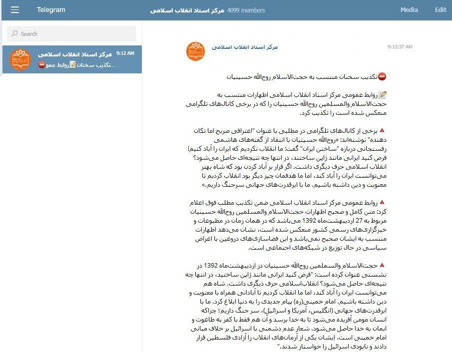 روابط عمومی مرکز اسناد انقلاب اسلامی اظهارات منتسب به حجت‌الاسلام والمسلمین روح‌الله حسینیان را که در برخی کانال‌های تلگرامی منعکس شده است را تکذیب کرد.