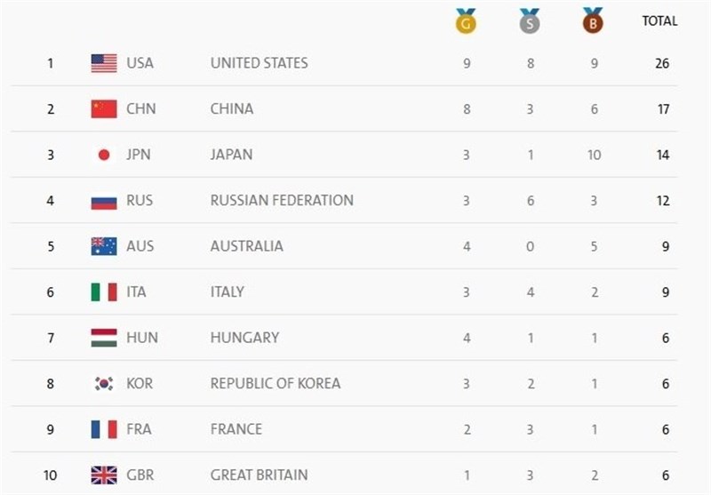 به گزارش خبرگزاری تسنیم، سیویکمین دوره بازیهای المپیک در حالی در شهر ریودوژانیروی برزیل در جریان است که آخرین وضعیت و تغییرات بهوجود آمده در جدول ردهبندی این بازیها نشان میدهد که آمریکا با کسب 9 مدال طلا، هشت نقره و 9 برنز و در مجموع با 26 مدال در صدر این جدول قرار دارد.