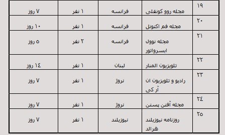 به گزارش خبرنگار اجتماعی باشگاه خبرنگاران تسنیم «پویا»؛ ادارهکل رسانه های خارجی وزارت فرهنگ و ارشاد اسلامی در مرداد ماه سال ١٣٩٥ مجموعا برای ٤٥ خبرنگار و عوامل خبری وابسته به ٢٥ رسانه خارجی از ١٤ کشور جهان مجوز «روادید مطبوعاتی موقت» برای فعالیت زماندار در کشور صادر کرد که جزئیات آن در جدول زیر قابل مشاهده است.