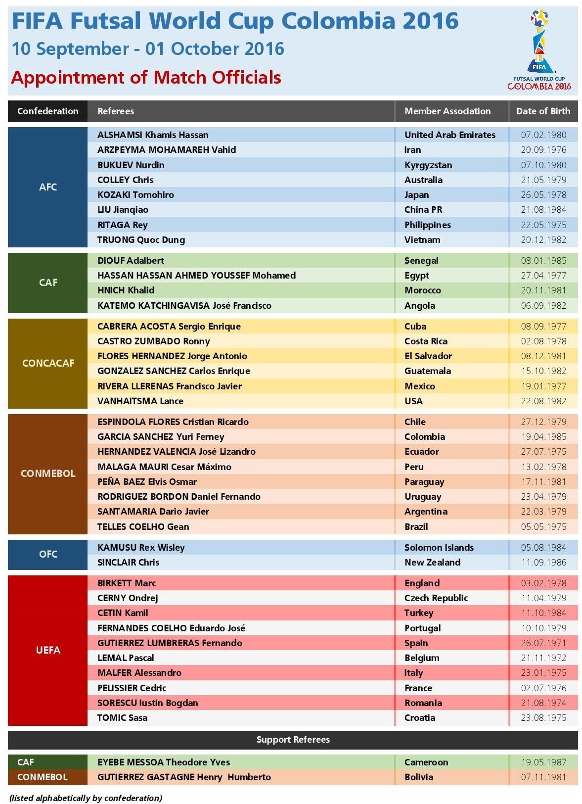 ماسیمو بوساکا، رئیس دپارتمان داوری فیفا در این باره گفت: ما متقاعد شدیم که این تیم داوری بهترین داوران ممکن برای قضاوت در مهمترین تورنمنت فوتسال جهان هستند. تمامی آنها کاملاً آماده هستند و پیش از این تواناییهای خود را در بالاترین سطح نشان دادهاند.