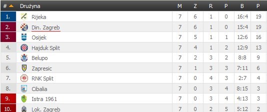 در جدول رده بندی لیگ کرواسی تیم‌های ریه کا و دینامو زاگرب با امتیاز مشابه 19 در رده‌های اول و دوم جدول رده بندی قرار دارند.