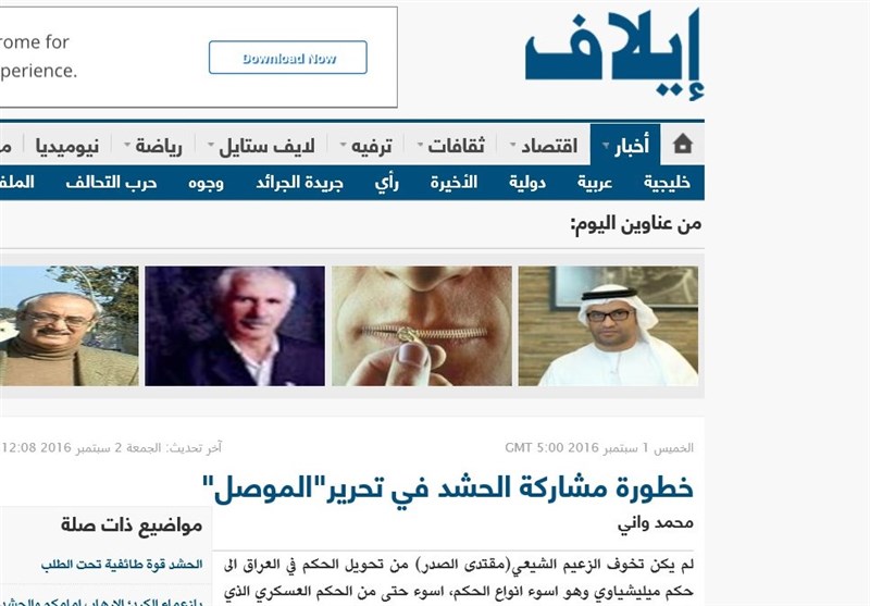 ایلاف دیگر رسانه سعودی در گزارش‌هایی برای تخریب وجهه نیروهای داوطلب مردمی با ادعای خطرناک بودن مشارکت حشد شعبی در آزادسازی موصل، از نگرانی سعودی‌ها از نقش تعیین‌کننده این نیروها در عملیات مهم آزادی این شهر از اشغال تروریست‌های تکفیری پرده برمی‌دارد.