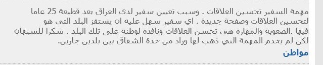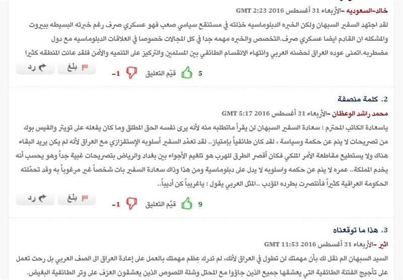 شماری از کاربران سعودی در اظهارنظرهای خود در پایان این خبر،بر رویکرد تنش‌‌آمیز و طایفه‌ای و منفی سفیر این رژیم در عراق و تلاش‌های وی برای شعله‌ور کردن آتش فتنه مذهبی مهر تایید زده‌اند.